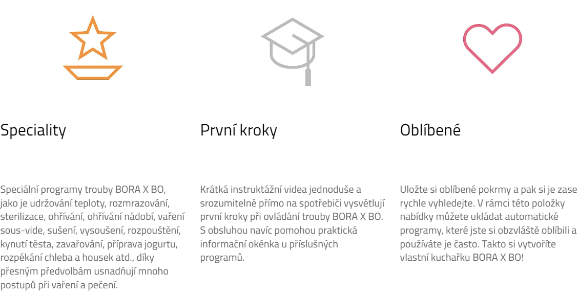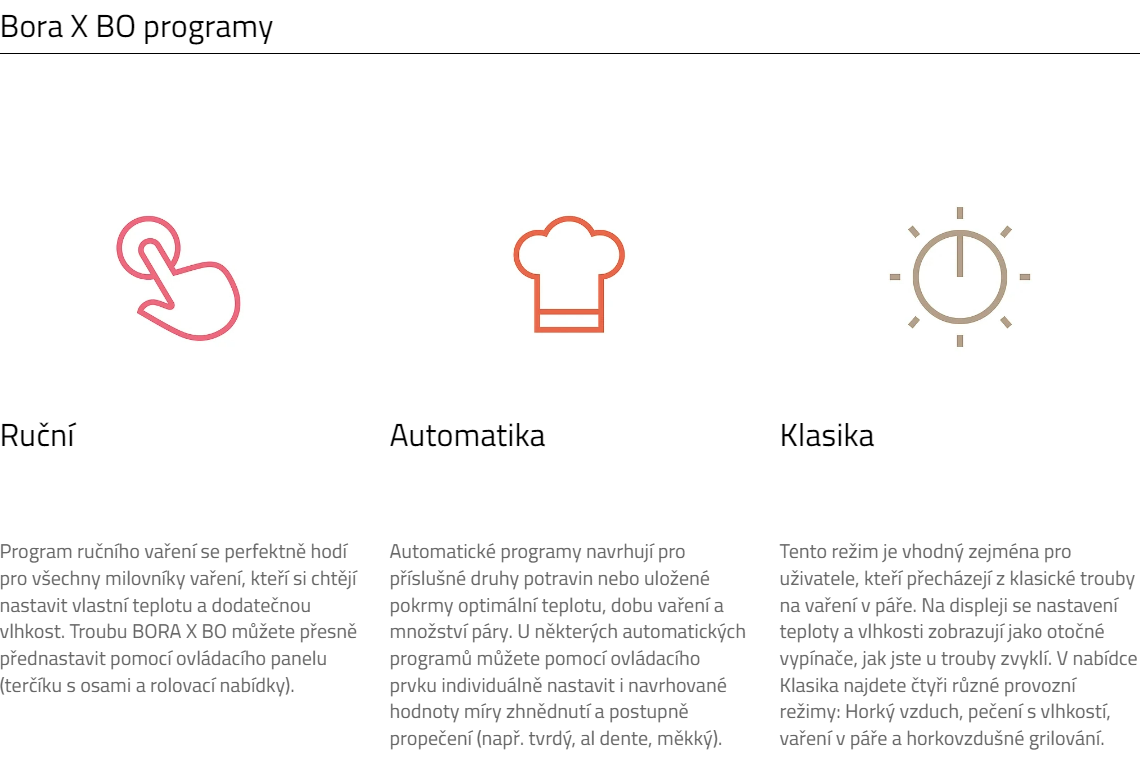 Trouba BORA X BO se ovládá pomocí velkého 19palcového displeje, který můžete v případě potřeby také vyklopit. Dotykový displej reaguje na dotyky prstu stejným způsobem jako třeba váš chytrý telefon. Díky spoustě přednastavených programů a intuitivní navigaci uživatele bude vaření hračka!