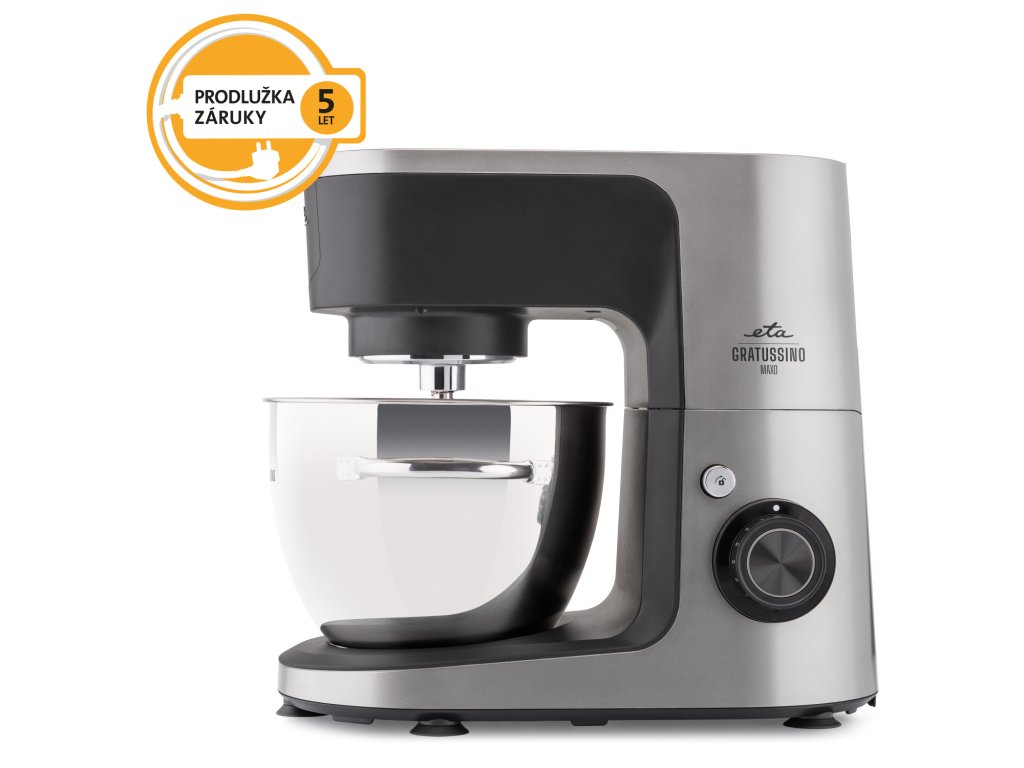 Multifunkční kuchyňský robot ETA Gratussino III Maxo s kovovými převody a bohatou výbavou šlehá, míchá i hněte těsto. Poradí si také se strouháním zeleniny, mletím masa a hravě umixuje zdravé smoothie, polévky i lahodnou zmrzlinu.