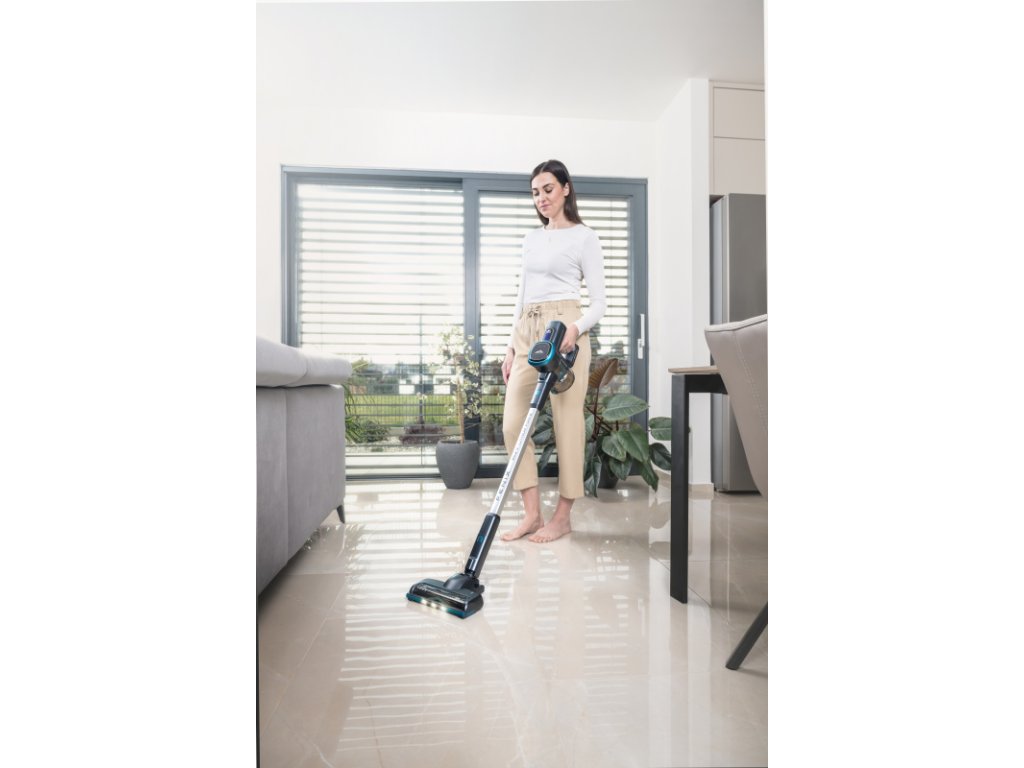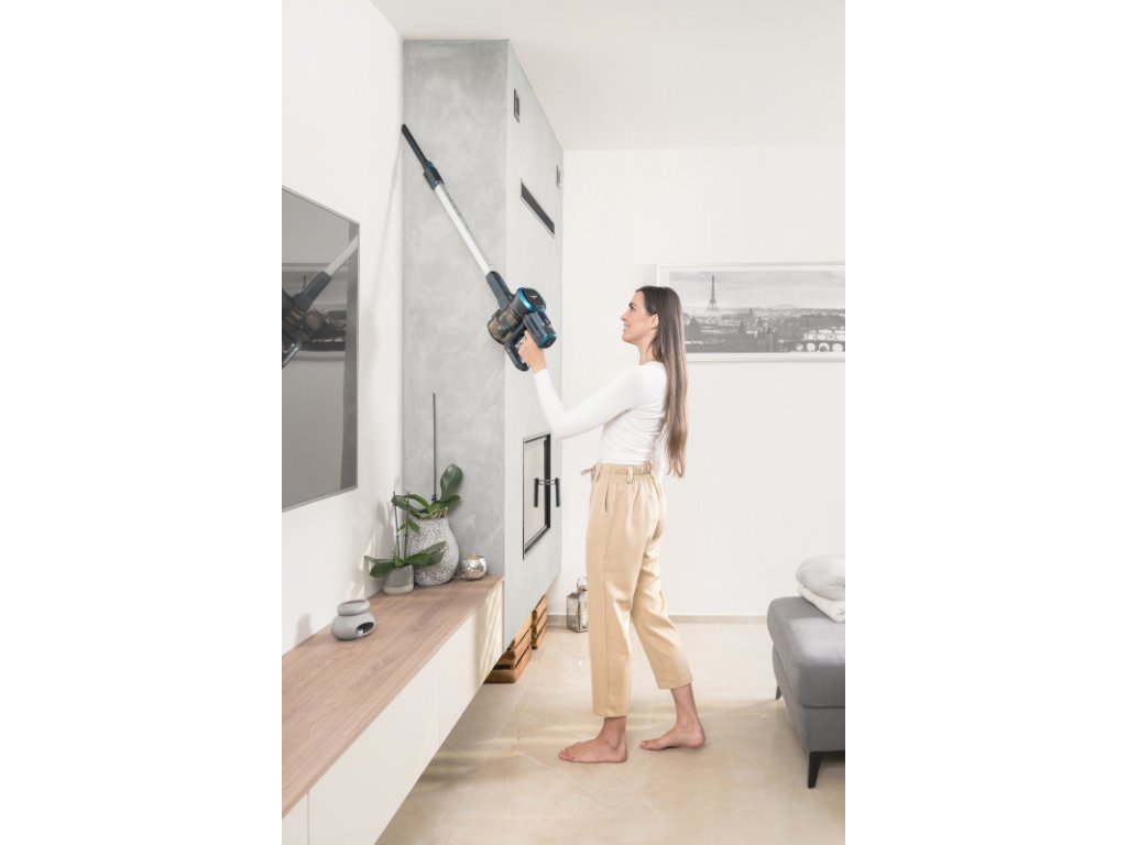 - Bezdrátový provoz: Díky výkonnému akumulátoru můžete vysávat až 40 minut bez přerušení. Akumulátor lze v případě potřeby z vysavače jednoduše odejmout a nabíjet odděleně. Nebo můžete vložit „náhradní“ akumulátor (není součást balení) a prodloužit si tak délku chodu.